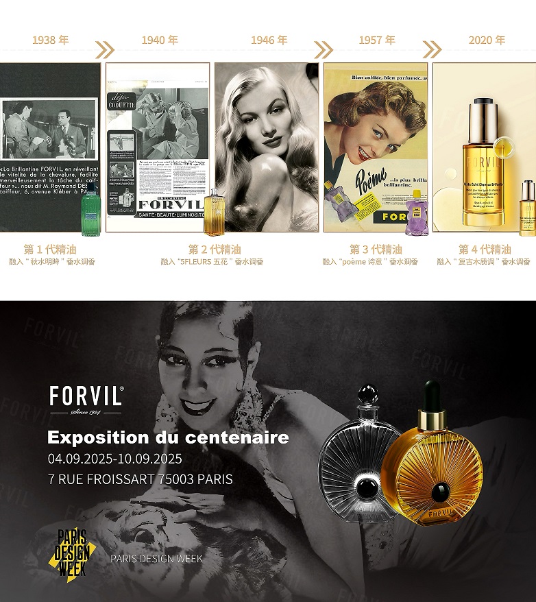 2025年9月4日,在全球设计界年度盛事「巴黎设计周」上,法国百年SPA奢护养发品牌FORVIL以一场百年纪念展,优雅拉开了其跨越世纪的美学序幕。本次展览宛如一座时光桥梁,连接品牌的历史传承与当代创新,并以百年限定“黑珍珠护发精华油”等展品为核心,向世界展示品牌独有的美学格调与艺术情怀。