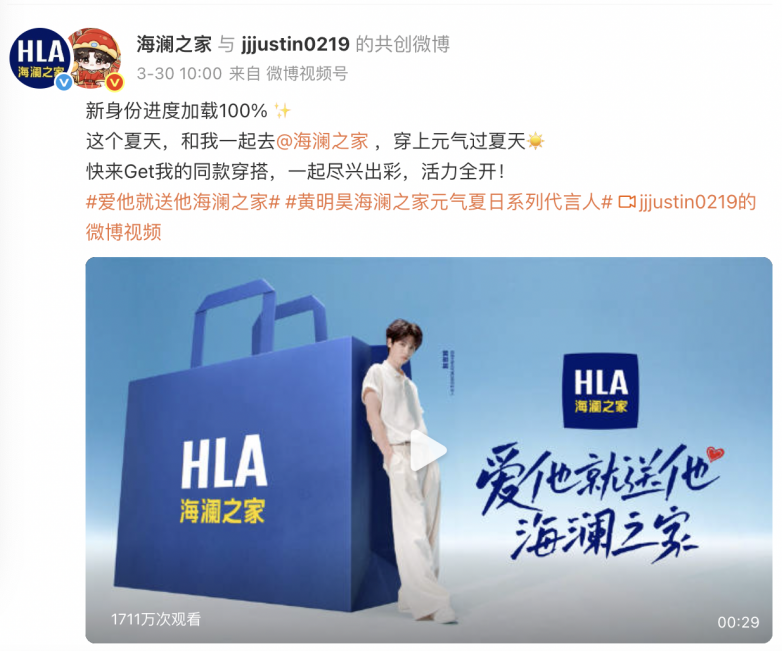 近日,中国男装领军品牌海澜之家官宣,青年歌手、演员黄明昊(Justin)成为其元气夏日系列代言人。一则看似寻常的代言公告,背后却藏着国民品牌与Z世代的一次深度对话。