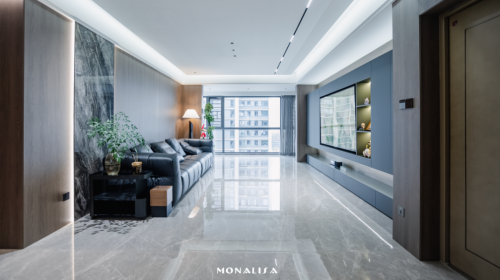 这套家装大面积采用黑灰中性色,流露出一种沉稳克制的高级感,搭配护墙板以及定制柜体的木质色调相得益彰,凸显出意式奢雅有度的美感。地面通铺蒙娜丽莎瓷砖750×1500mm规格的伊朗灰大砖,将公共区域自然流畅地连成一片,更显开阔大气;浅灰砖面分布着错落的米白细纹,赋予空间低调奢华的质感。无主灯设计让光线均匀洒射到砖面上,反射出柔和的光感,恰好中和了深木色墙面的沉静,提升空间的通透感与呼吸感。