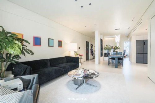 全屋遵循“6-3-1”色彩搭配法则,以60%奶油中性色为主色调,搭配30%深色做点缀,辅以5%金属色和5%五彩缤纷的鲜花,营造出温馨、静谧、舒适的空间感。地面大面积铺贴蒙娜丽莎瓷砖巴黎印象2.0系列750×1500mm规格瓦洛拉大砖,细腻的肌肤釉质感与温暖的米色调相融合,给人一种浪漫而雅致的既视感,搭配同色系的墙面与柜体,温柔的奶油色调在空间内自由流淌。开放式空间设计,不仅带来更宽阔自由的生活空间,更创造了更多交流互动的机会,有助于增进家人之间的感情。