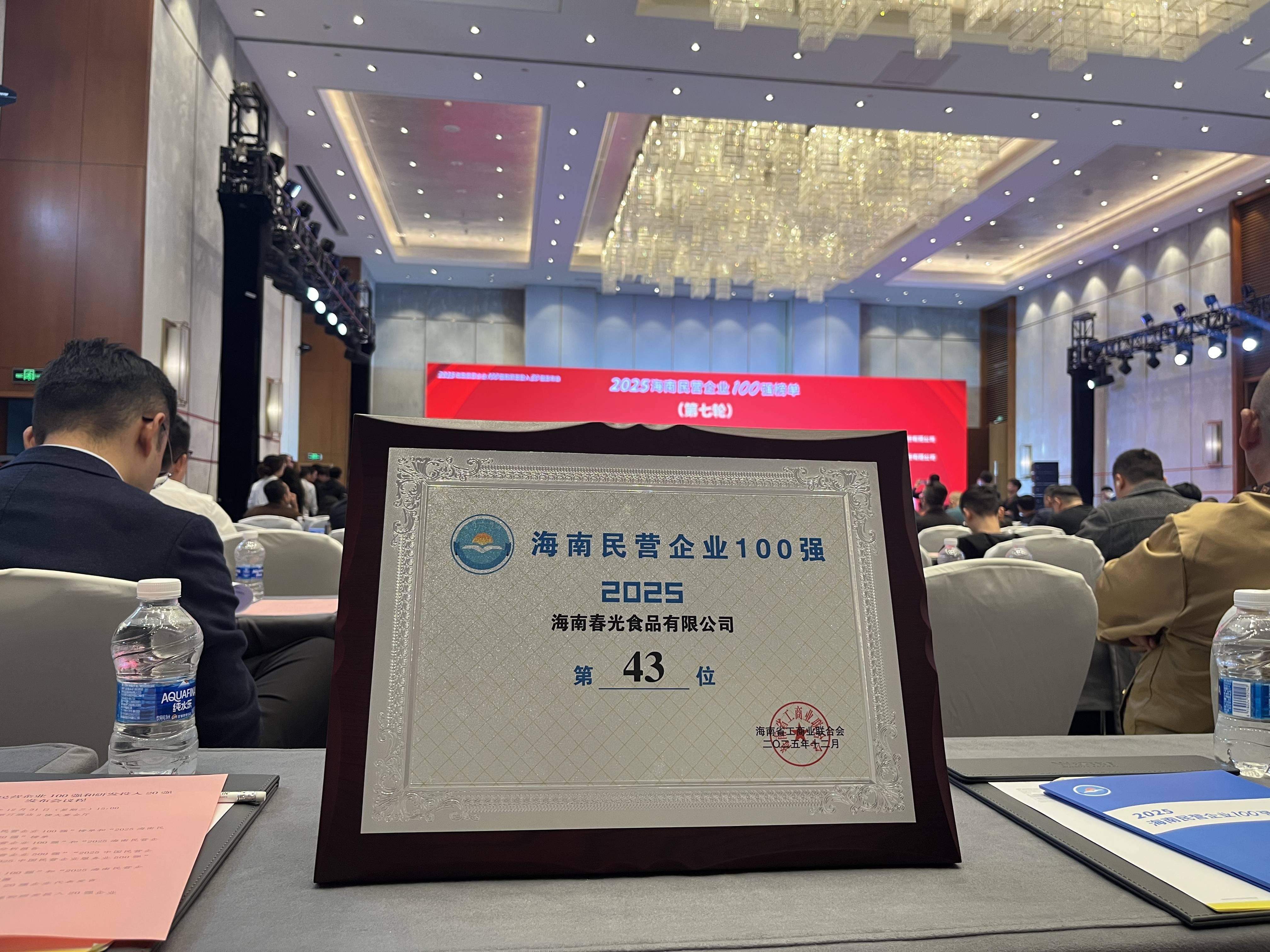 12月31日,由海南省工商联合会、海南省科学技术厅联合举办的2025海南民营企业100强及研发投入20强发布会在海口举行,现场正式发布了“2025海南民营企业100强”榜单。春光食品凭借稳健的经营表现、持续提升的综合实力和良好的发展潜力,成功入选榜单,位列海南民营企业100强第43位。