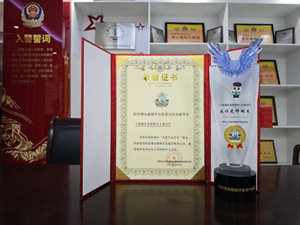 2026年1月9日,在第六个中国人民警察节到来之际,上海市公安局浦东分局陆家嘴治安派出所与浦发银行上海分行举行党建共建活动。活动现场,陆家嘴治安派出所为浦发银行上海分行、陆家嘴支行颁发“陆家嘴金融城平安联盟突出贡献单位”荣誉证书及“反诈先锋网点”奖杯,表彰该行在金融安全保卫与反诈工作中作出的突出贡献。