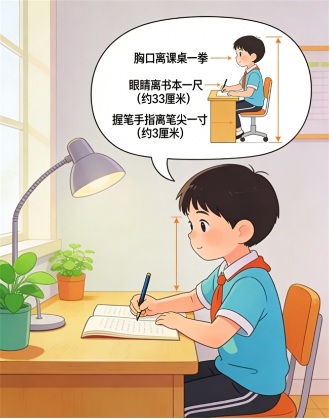 不仅如此,孩子假期需完成各类作业,长时间伏案书写同样是视力健康的 “隐形杀手”,家长务必督促孩子保持 “一拳一尺一寸” 的正确坐姿:胸口与书桌保持一拳距离,眼睛与书本保持一尺(约 33 厘米)距离,握笔手指与笔尖保持一寸(约 3 厘米)距离。