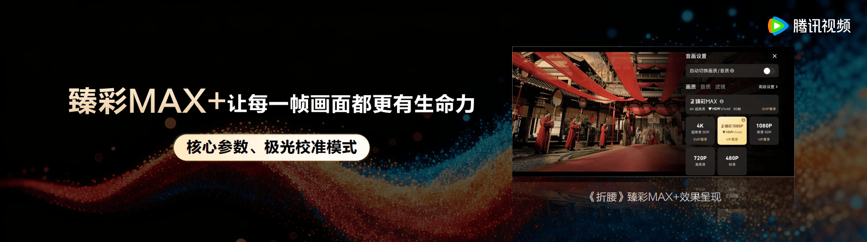 如果说AI智能助手解决了“怎么用”的问题,那么臻彩MAX+则提升了“怎么看”的体验。“臻彩MAX+”是腾讯视频“臻彩视听”系列自主研发品牌的一次重磅升级,它所搭载的HDR Vivid技术支持4K分辨率与60帧高帧率,实现了高动态范围与广色域的双重突破。与传统视频相比,“臻彩MAX+”使色彩层次更加丰富,色域提升约40%,亮部细节增强至3倍,画面流畅度也显著提高,为用户带来更具沉浸感的观影体验。更值得一提的是,配套的“极光校准模式”能够根据不同内容类型,自动匹配导演预设的色彩参数,精准还原创作意图的色彩与光影细节,最大限度保留作品的原始艺术表达。这一技术不仅提升了画质,更体现出对创作者的尊重。