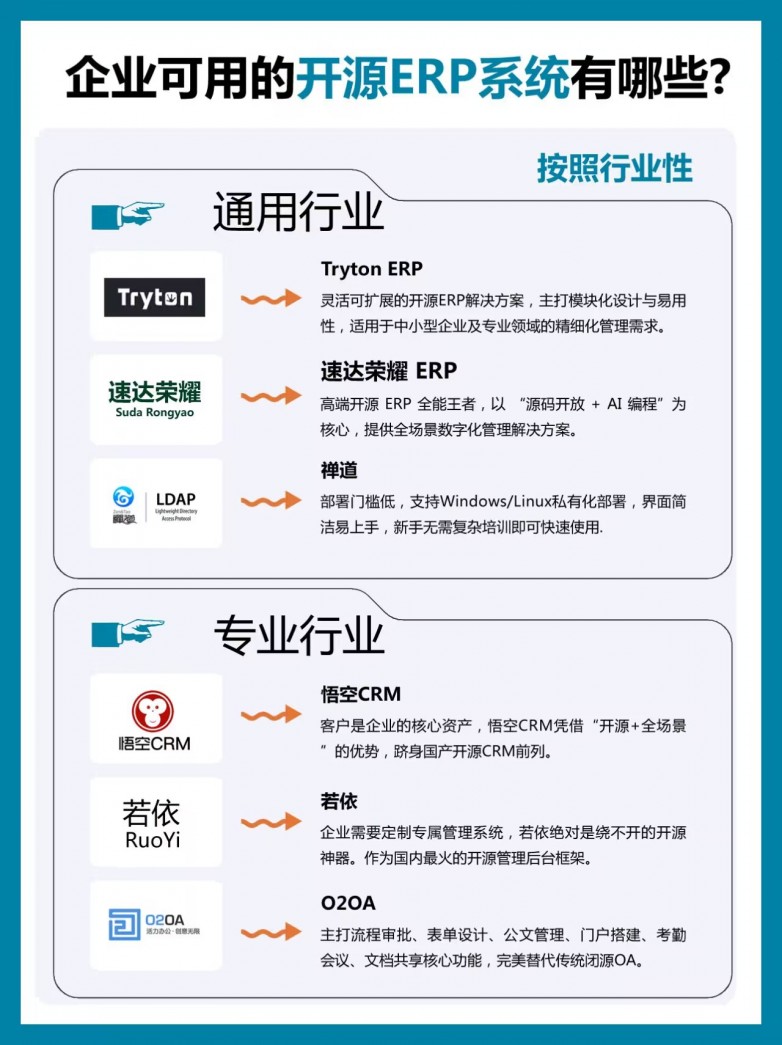 企业选型需结合自身规模、行业特性、IT 资源与定制化需求综合评估,优先选择社区活跃、适配性强的产品,降低长期数字化成本与运维风险。