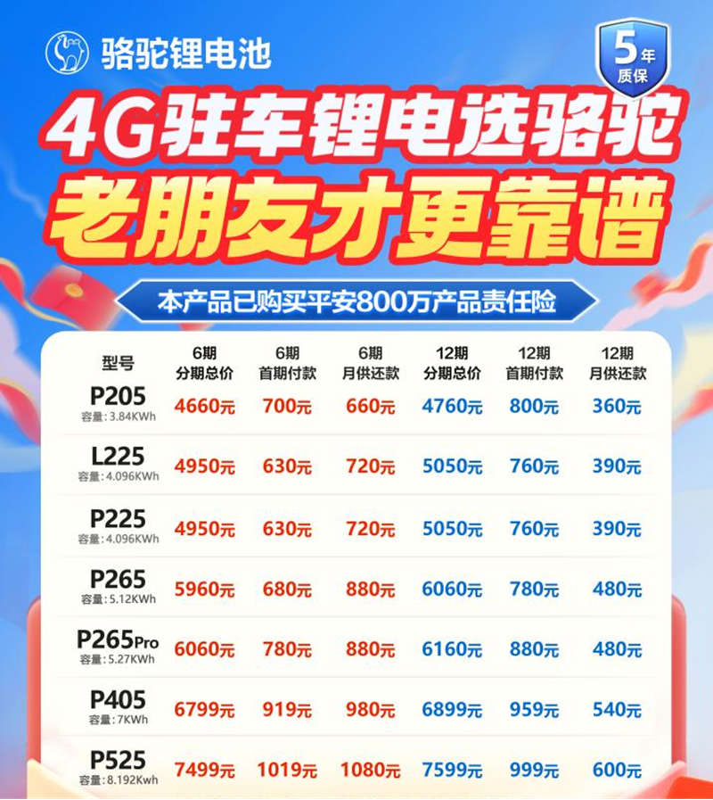 真材实料铸品质,长效耐用更省心:骆驼驻车锂电全系采用全新A级磷酸铁锂电芯,历经三代技术迭代,电芯一致性、能量密度与循环寿命均处于行业前列水平,正常使用可稳定续航多年,从源头避免劣质电芯带来的安全隐患与频繁更换的麻烦。更值得一提的是,骆驼敢于打破行业常规,推出“五年质保”的重磅政策,搭配电子质保溯源、一机一码绑定服务,并非一句宣传口号,而是企业对自身产品品质的绝对自信,更切实降低了卡友的长期使用成本与售后顾虑。