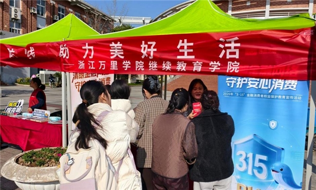 在浙江万里学院,宣传人员与大学生面对面交流,普及理性消费观念和金融基础知识,引导青年群体远离非法借贷陷阱。