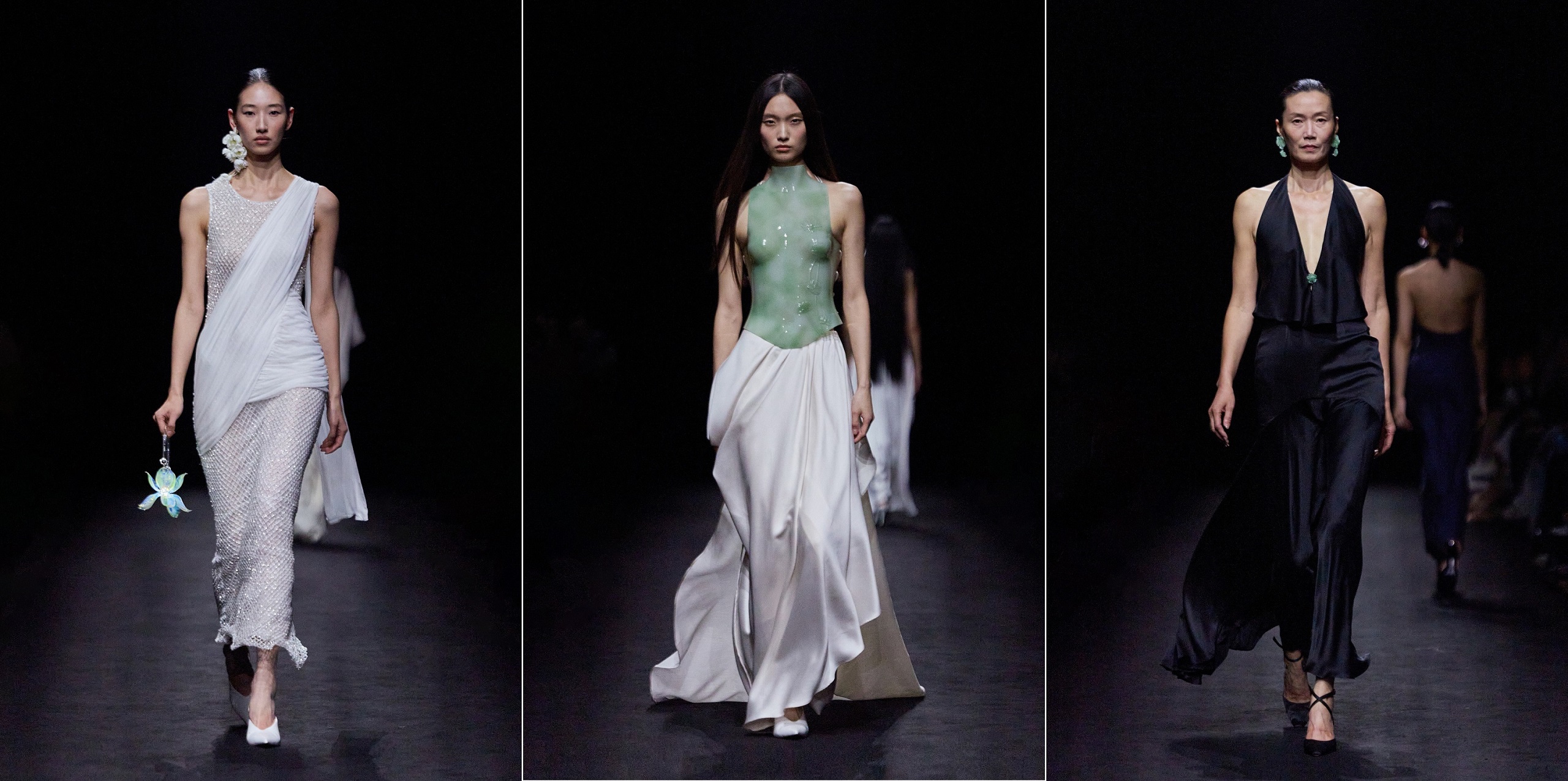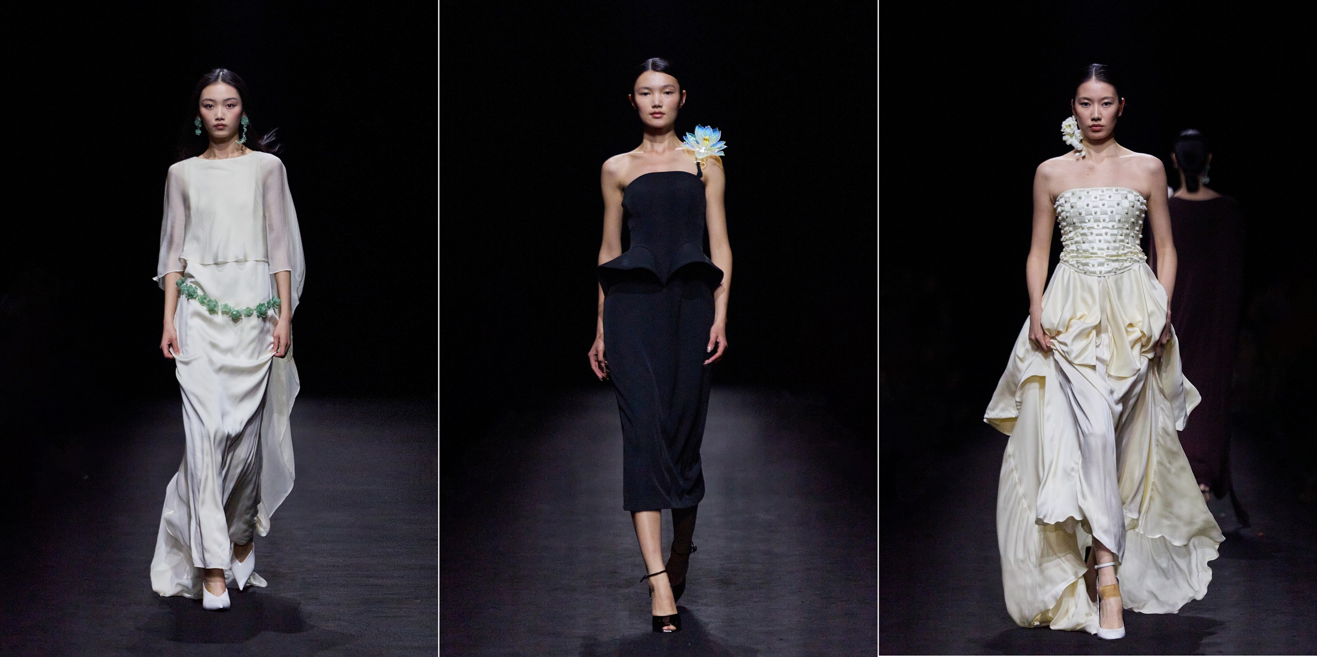 品牌以东方宇宙哲学为基底,坚守匠心工艺,为本系列构筑出形而上的时装体系。在设计表达中,真丝成为核心材质,品牌打破其单一使用形式,从轻盈通透的欧根纱,到兼具挺括质感的丝羊毛剪裁,挖掘真丝的多元表达维度;同时以当代廓形重释中国古代竹编技法,将莲花意象与莹润玉石质感融入设计,让每件衣物都成为承载光与东方气韵的独特载体,实现哲学思考与时装设计的深度对话。