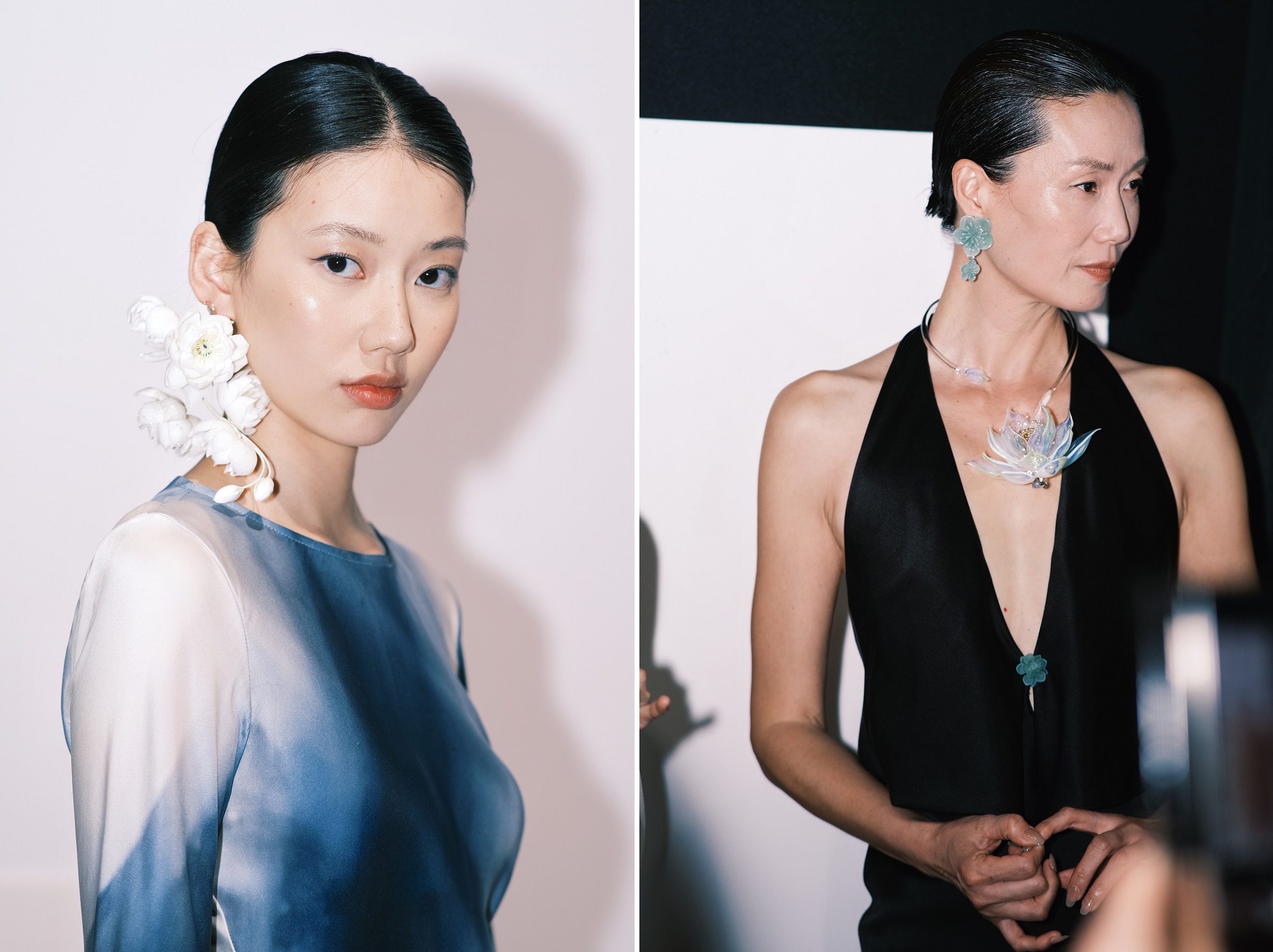 品牌与通草工艺匠人荷露柳风深度合作,深挖通草材质细腻温润的触觉特质,为这一古老非遗技艺注入当代审美,让通草的独特肌理在时装中绽放新的生命力;同时联袂玻璃艺术家申昊,以高温塑形与微叠层的精湛工艺重塑植物形态,打造出半透明花艺雕塑,让光成为创作的媒介与核心,将艺术创作与时装设计完美融合,展现传统工艺与当代艺术结合的无限可能,彰显东方手工技艺的创新表达与文化自信。
