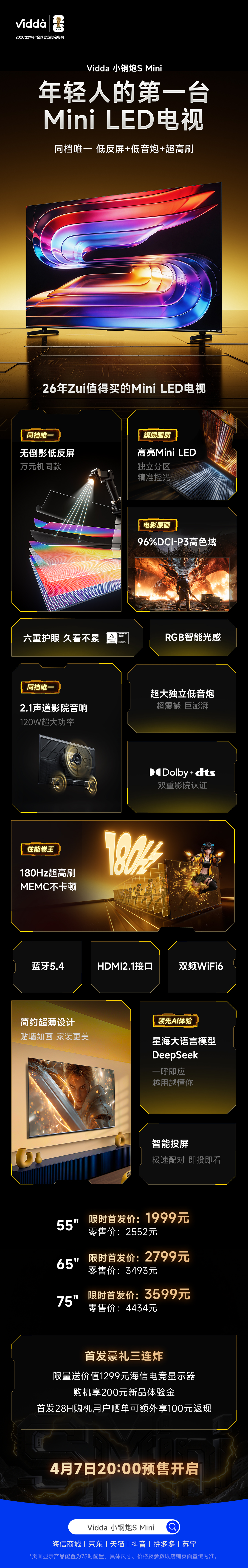 4月7日20:00,Vidda 小钢炮S Mini已正式登陆Vidda电商全渠道店铺,55/65/75英寸三大主流规格全线上架,首发期1999元起即可入手。年轻人的第一台Mini LED电视,从来不该是妥协的选择,这款把旗舰配置拉满、质价比拉到顶的影音神器,闭眼冲就对了!