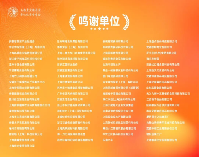 本届大会的圆满举办,离不开各合作单位与赞助企业的鼎力襄助。 感谢所有为大会提供支持与保障的品牌方、服务商及合作伙伴。正是多方力量的汇聚,才成就了这场徽菜产业的年度盛会。携手同行,未来可期!