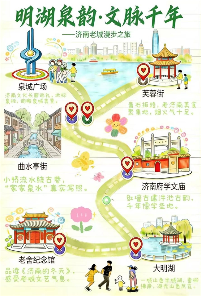 《泉南文博绿野》这条线路则另辟蹊径,以“生态+文博”为主题,串联泉城公园、山东省文化馆、济南市博物馆、千佛山,打造一条自然与人文交融的休闲动线,尤其适合亲子家庭与休闲养生人群。三条路线,每一条都配套“路书”指南,集成交通接驳、错峰时段、餐饮信息,让游客真正实现“说走就走的深度游”。